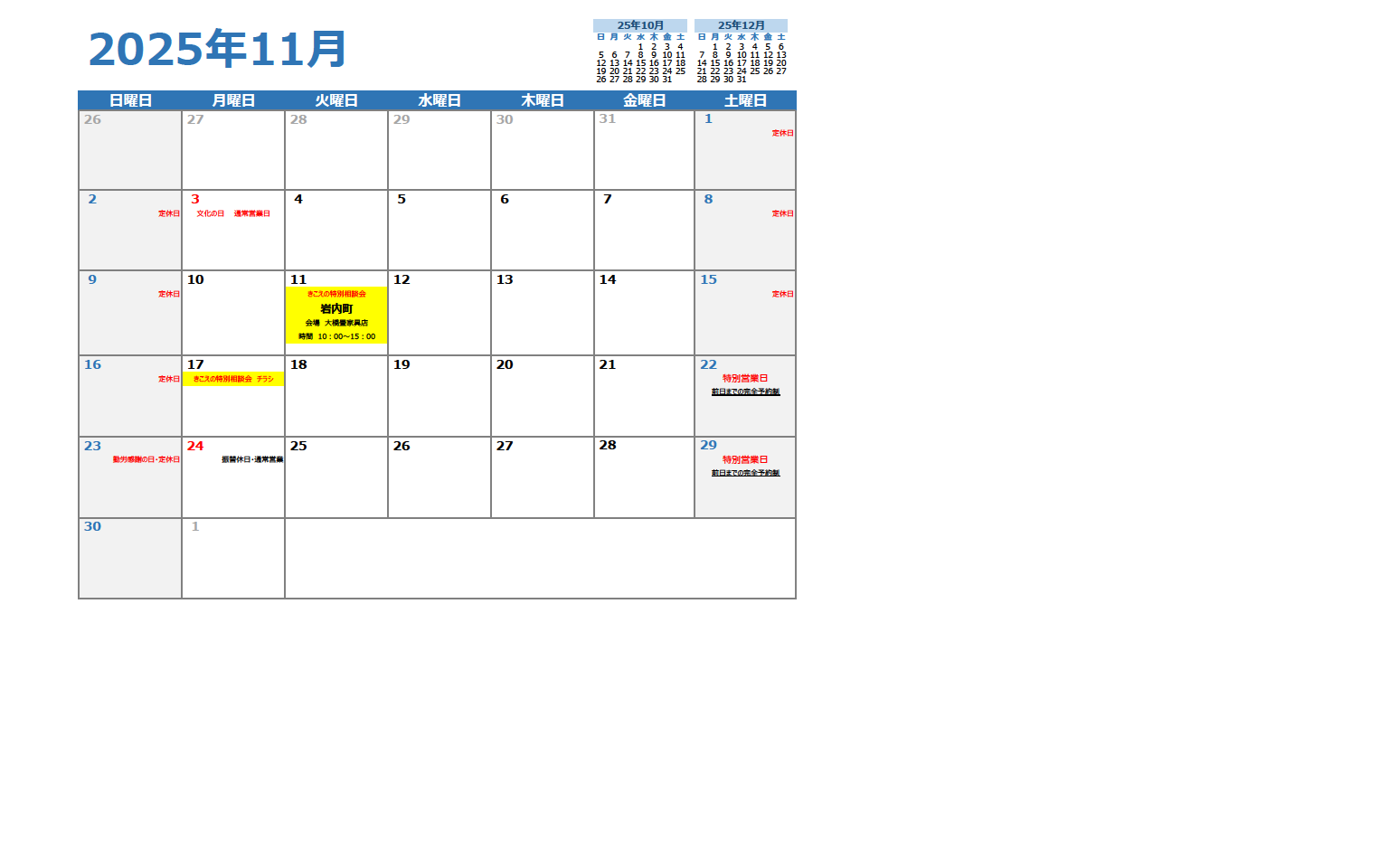 2025.10.22 相談会 【おたる本店】石狩・後志・空知① 11月の相談会日程表を更新しました。 ホーム > お知らせ > 相談会 > 【おたる本店】石狩・後志・空知① 11月の相談会日程表を更新しました。