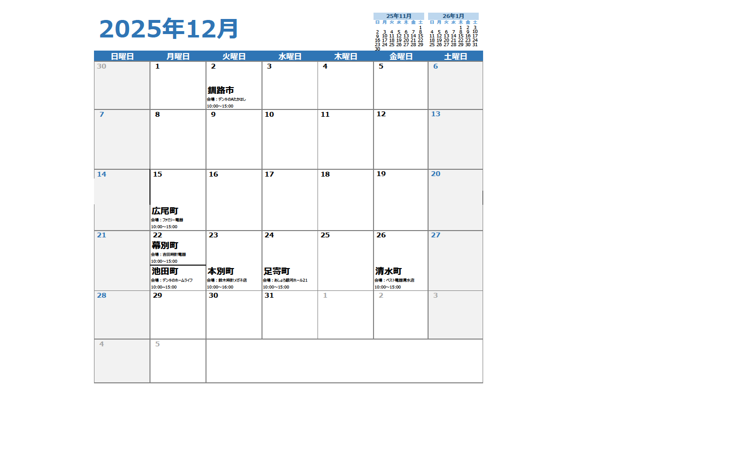 2025.11.20 相談会 【エスタ帯広店】十勝・日高②地方 12月の相談会日程表を更新しました。 ホーム > お知らせ > 相談会 > 【エスタ帯広店】十勝・日高②地方 12月の相談会日程表を更新しました。