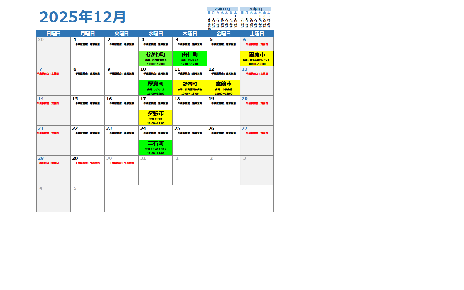 2025.11.20 相談会 【千歳駅前店】胆振・日高①地方 12月の相談会日程表を更新しました。 ホーム > お知らせ > 相談会 > 【千歳駅前店】胆振・日高①地方 12月の相談会日程表を更新しました。