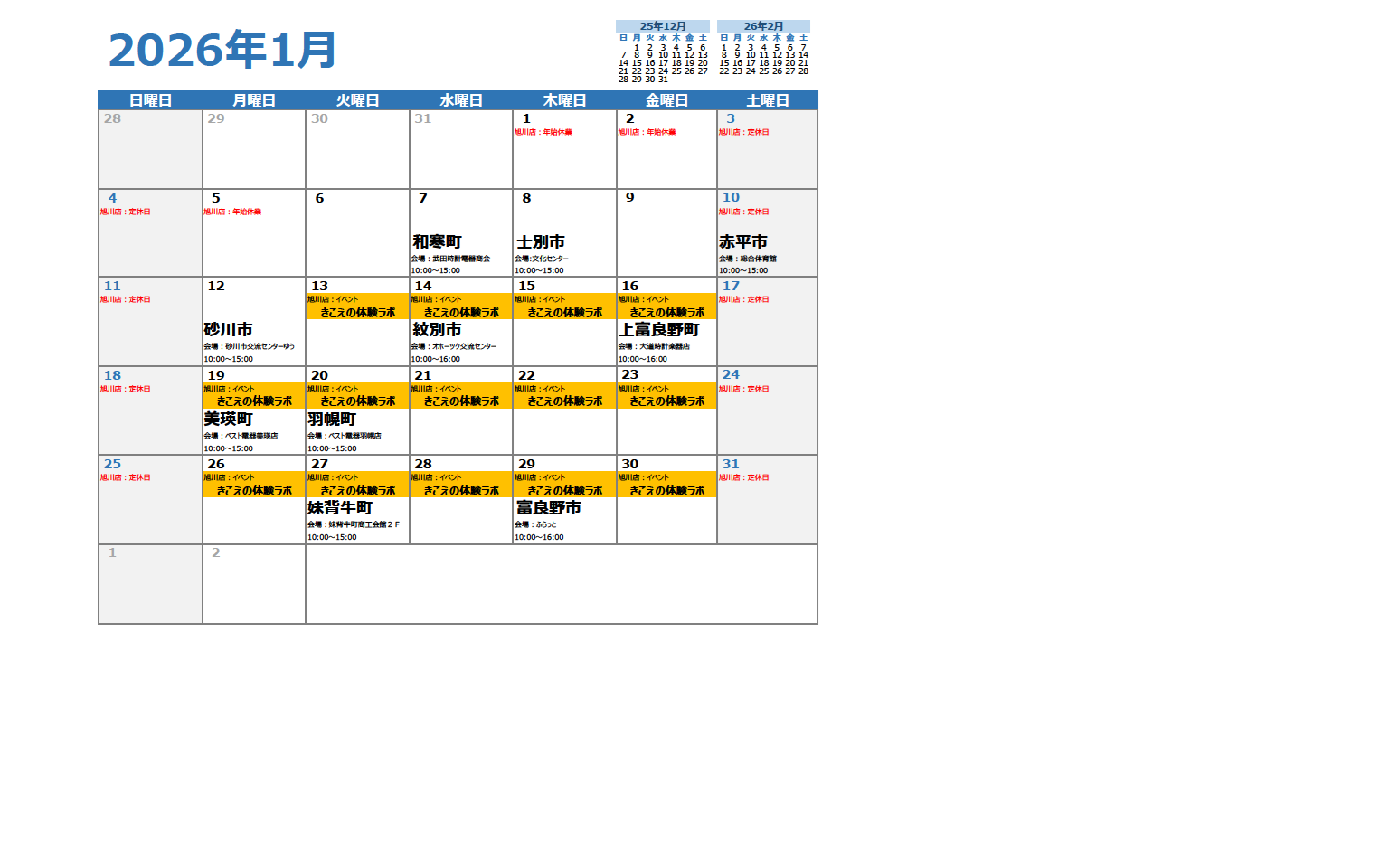 2025.12.26 相談会 【旭川店】空知②・上川・留萌・北見地方 1月相談会の日程表を更新しました。 ホーム > お知らせ > 相談会 > 【旭川店】空知②・上川・留萌・北見地方 1月相談会の日程表を更新しました。