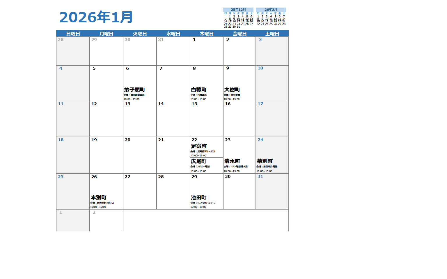 2025.12.26 相談会 【エスタ帯広店】十勝・日高②地方 1月の相談会日程表を更新しました。 ホーム > お知らせ > 相談会 > 【エスタ帯広店】十勝・日高②地方 1月の相談会日程表を更新しました。