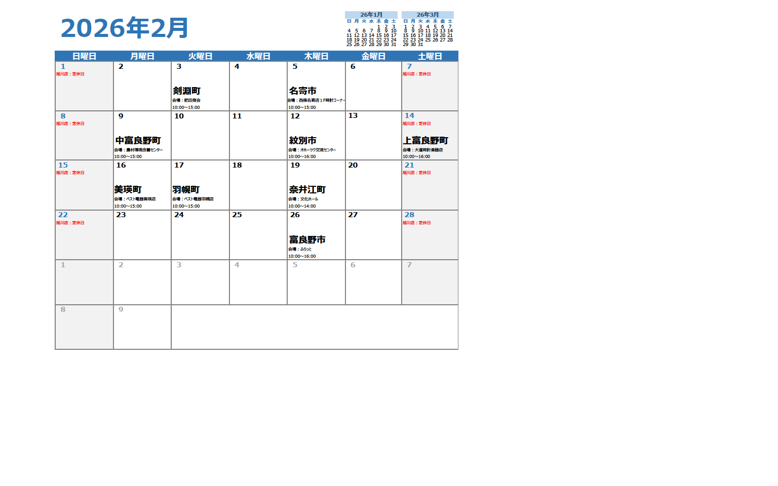 2026.1.30 相談会 【旭川店】空知②・上川・留萌・北見地方 2月相談会の日程表を更新しました。 ホーム > お知らせ > 相談会 > 【旭川店】空知②・上川・留萌・北見地方 2月相談会の日程表を更新しました。