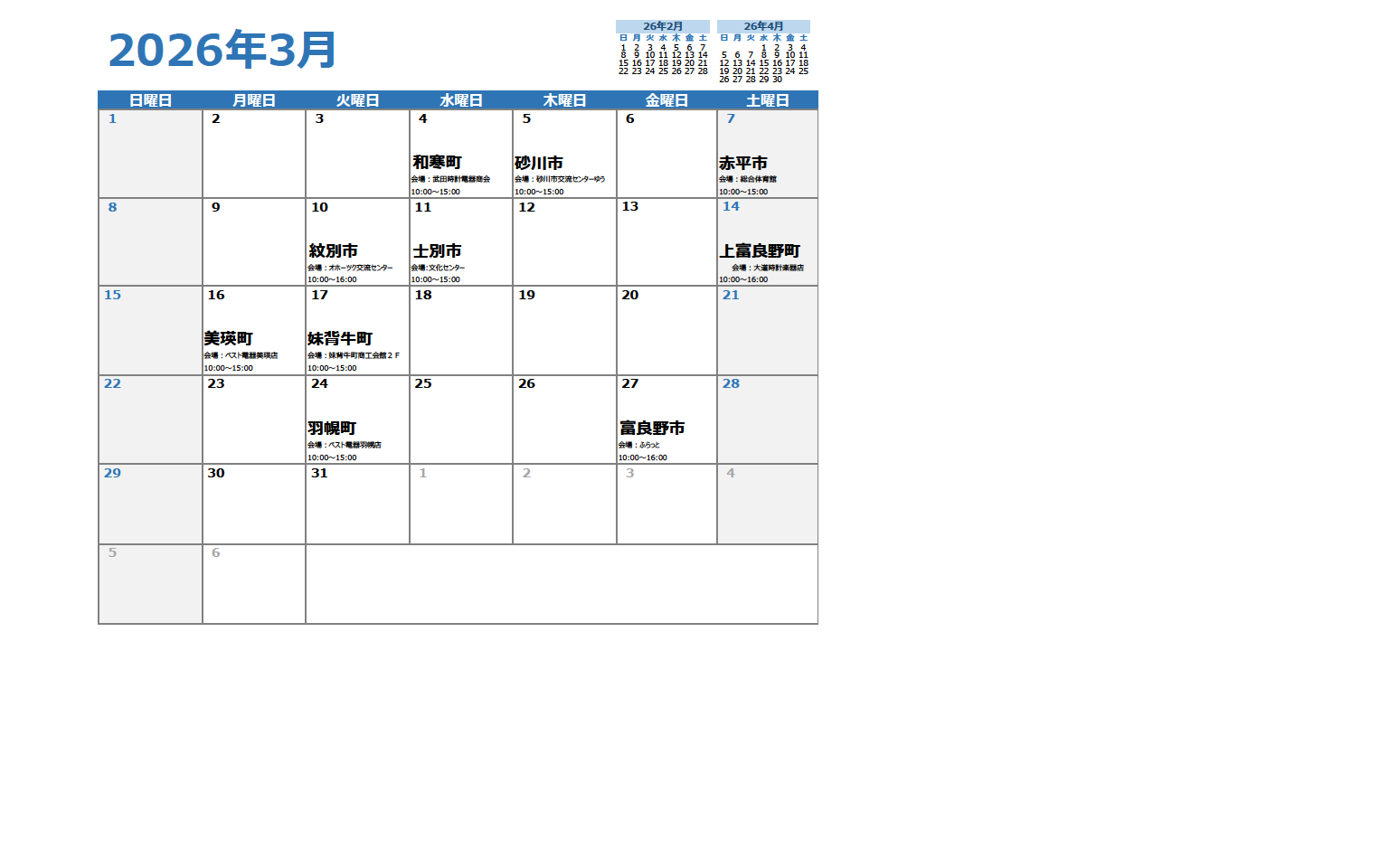 2026.2.27 相談会 【旭川店】空知②・上川・留萌・北見地方 3月相談会の日程表を更新しました。 ホーム > お知らせ > 相談会 > 【旭川店】空知②・上川・留萌・北見地方 3月相談会の日程表を更新しました。