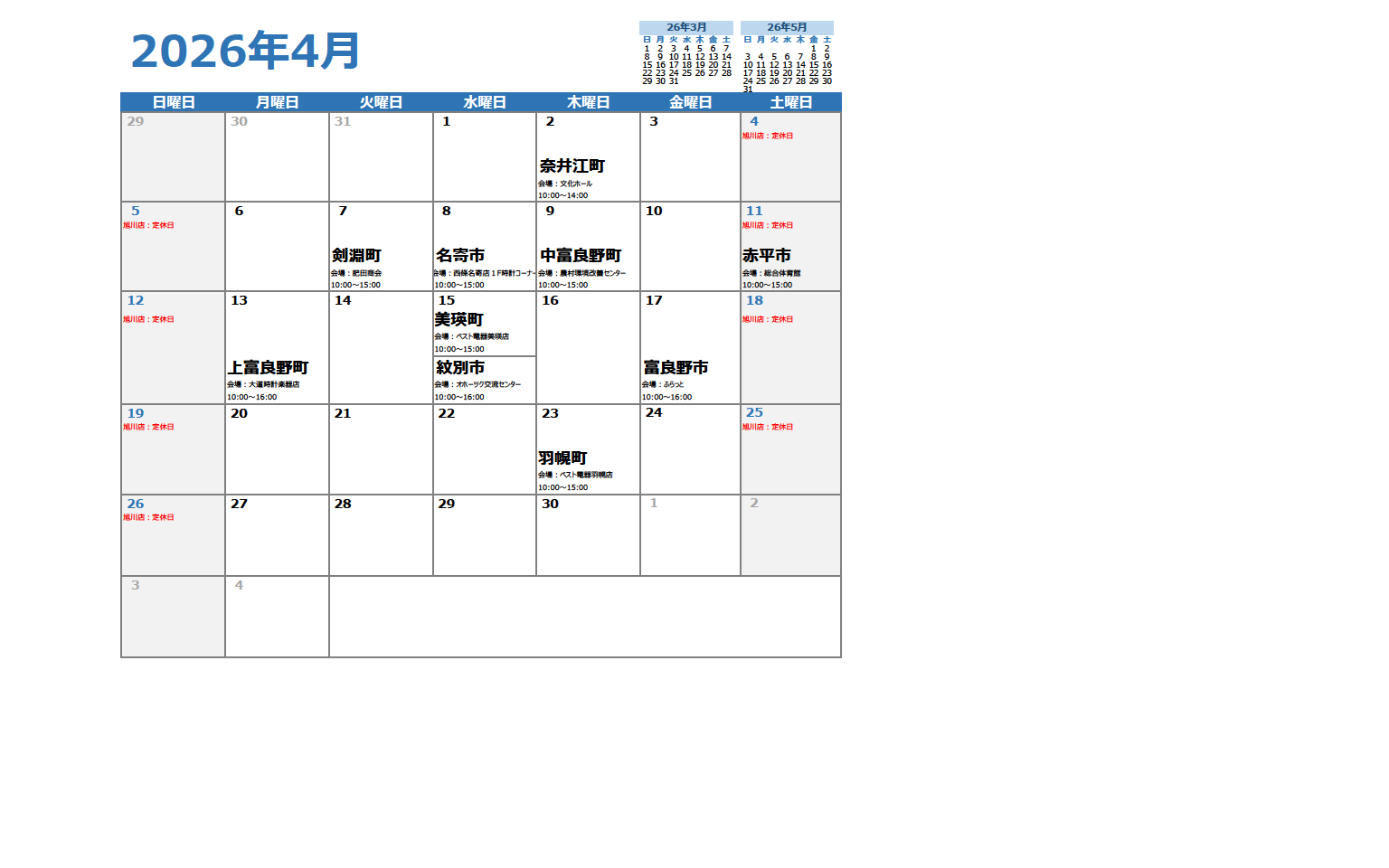 2026.4.9 相談会 【旭川店】空知②・上川・留萌・北見地方 4月相談会の日程表を更新しました。 ホーム > お知らせ > 相談会 > 【旭川店】空知②・上川・留萌・北見地方 4月相談会の日程表を更新しました。