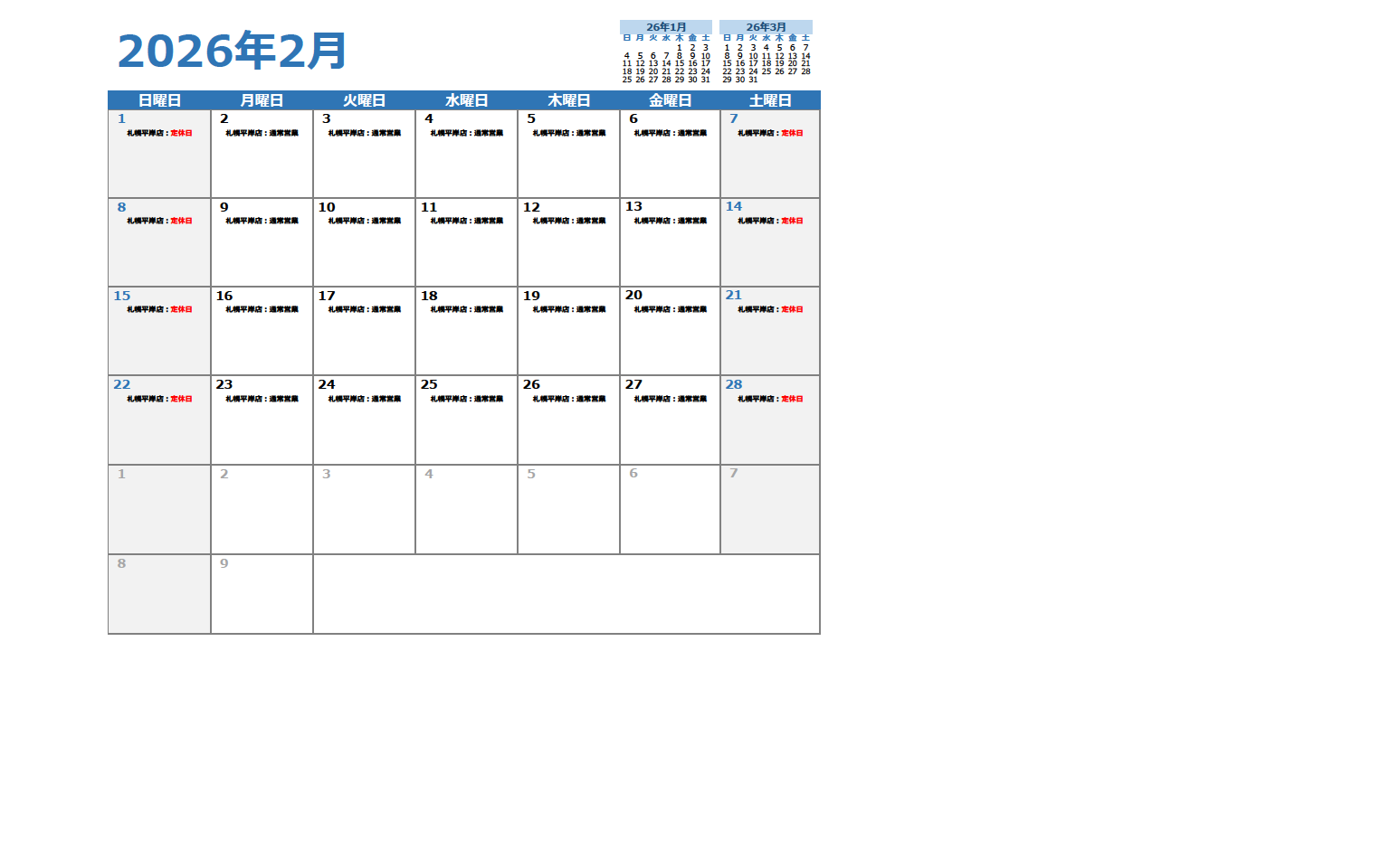 【札幌平岸店】1月の日程表を更新しました。